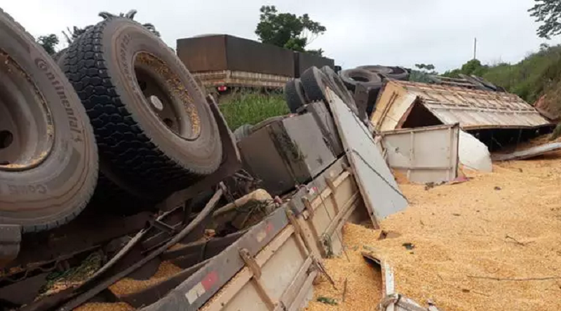 (Foto:Reprodução) – Até o momento, a hipótese é que o condutor da carreta que transportava soja teria perdido o controle do veículo e tombou na rodovia