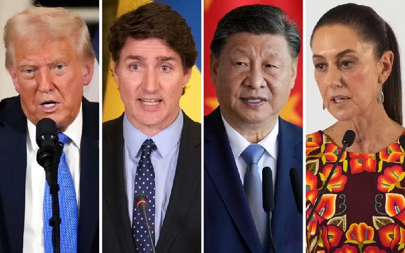 Combinação de foos mostra, da esquerda para a direita, o presidente dos Estados Unidos, Donald Trump; o primeiro-ministro do Canadá, Justin Trudeau; o presidente da China, Xi Jinping; e a presidente do México, Claudia Sheinbaum. — Foto: Associated Press