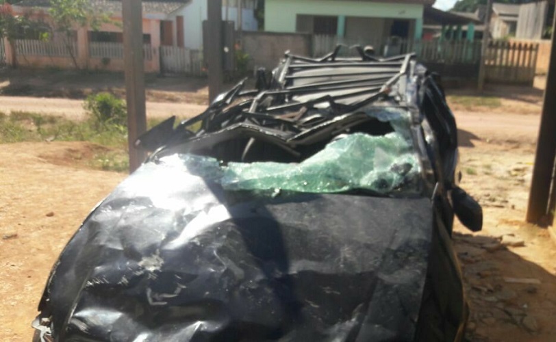 Carro capota após motorista desviar de buraco na BR-163 em Novo Progresso – Veiculo ficou destruído.