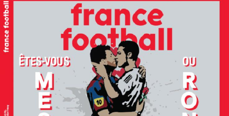 Capa da France Football estampa arte com beijo na boca entre Messi e CR7