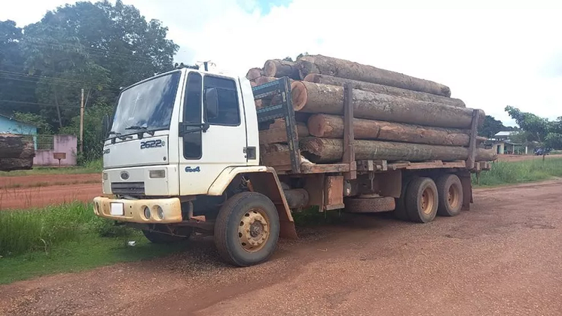 Carga com toras de madeira transportada ilegalmente é apreendida, no Pará