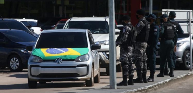 Cerca de 40 homens sairam de Belém para ajudar na operação. Participavam do ato pessoas vestindo verde e amarelo e empunhando bandeiras do Brasil em seus carros.