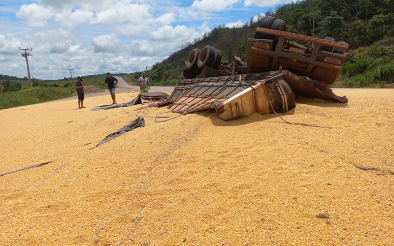 Uma carreta carregada com milho tombou, na tarde desta sexta-feira,12 de janeiro de 2024, na BR-163, próximo ao Transportadora Comando Diesel, em Novo Progresso.