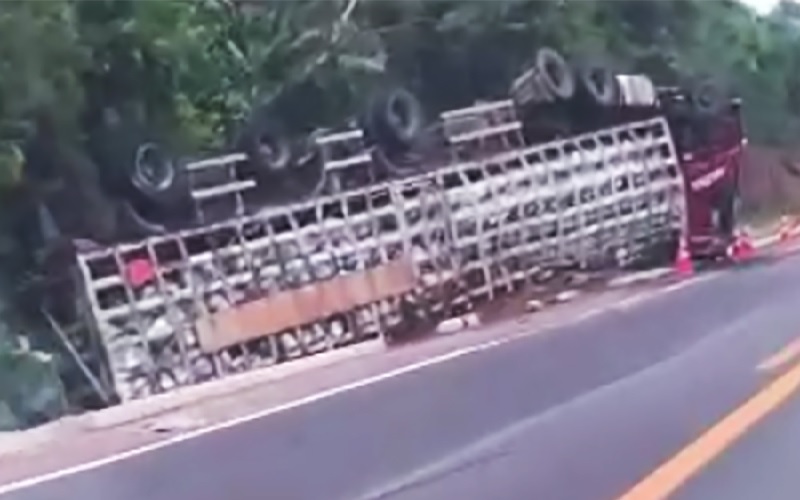 A carreta ficou às margens da rodovia com as rodas para cima, com danos no reboque e cavalo mecânico. A dinâmica do acidente não foi informada.