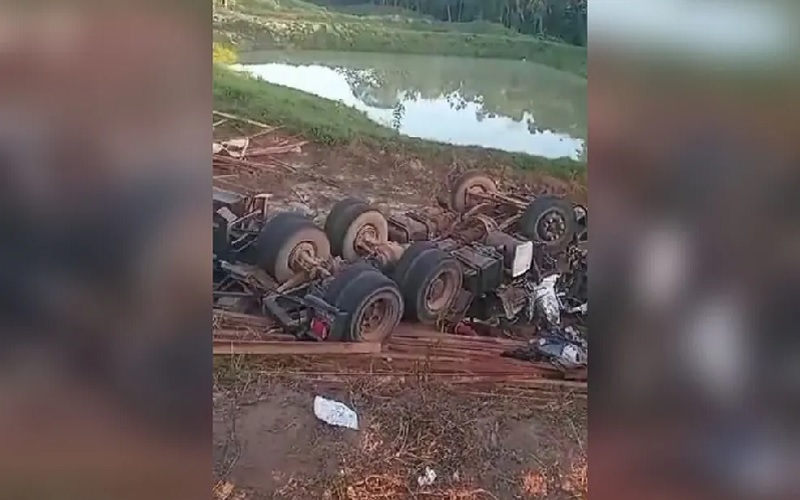 Carreta carregada com madeira tomba na BR-163 entre Rurópolis e Santarém; motorista ficou preso nas ferragens e morreu