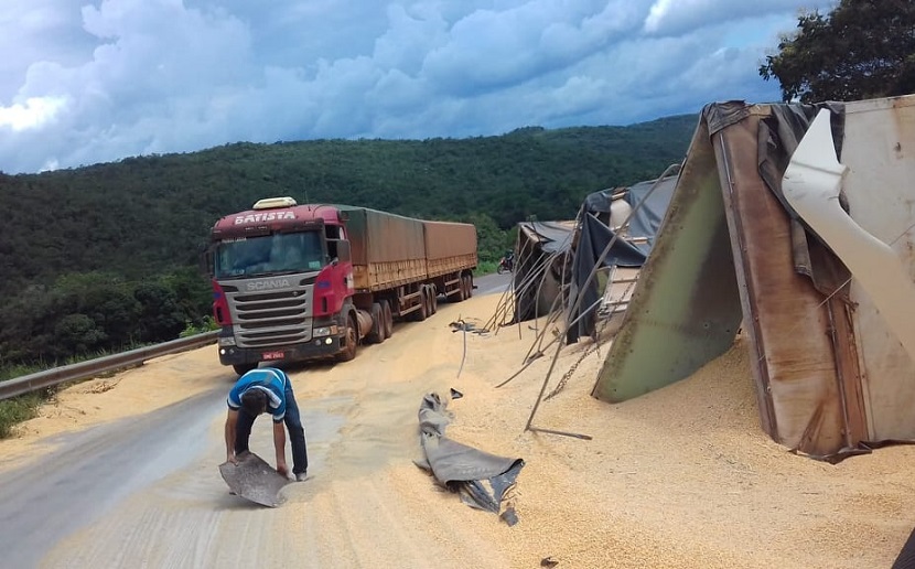 Carreta carregada com milho tomba e interdita parte da rodovia BR 163