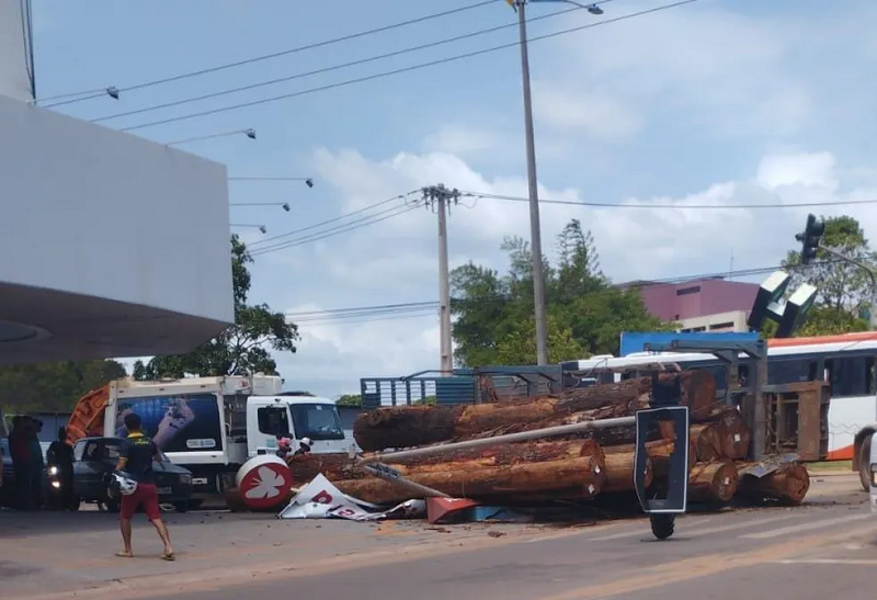 Carreta carregada com toras de madeira tomba na avenida Moaçara, em Santarém- Pará;Vídeo