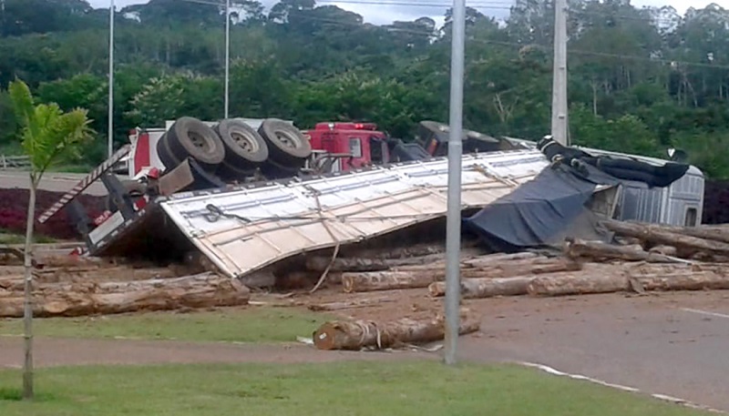 Carreta carregada com toras tomba na MT-208 em Alta Floresta
