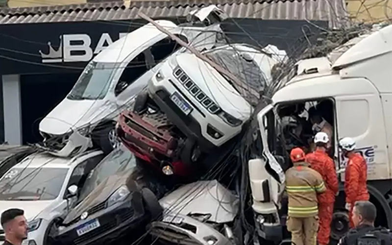 Carreta descontrolada atinge oito veículos e causa grande destruição