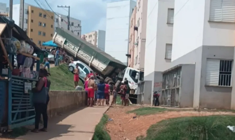 Segundo testemunhas, a carreta estava sendo descarregada, quando houve um estrondo e o veículo desceu em alta velocidade a ladeira que fica próxima aos prédios.