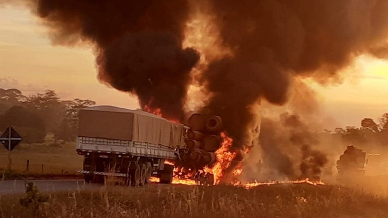 Carreta pega fogo e explode em rodovia de MT; motorista é retirado de cabine em chamas