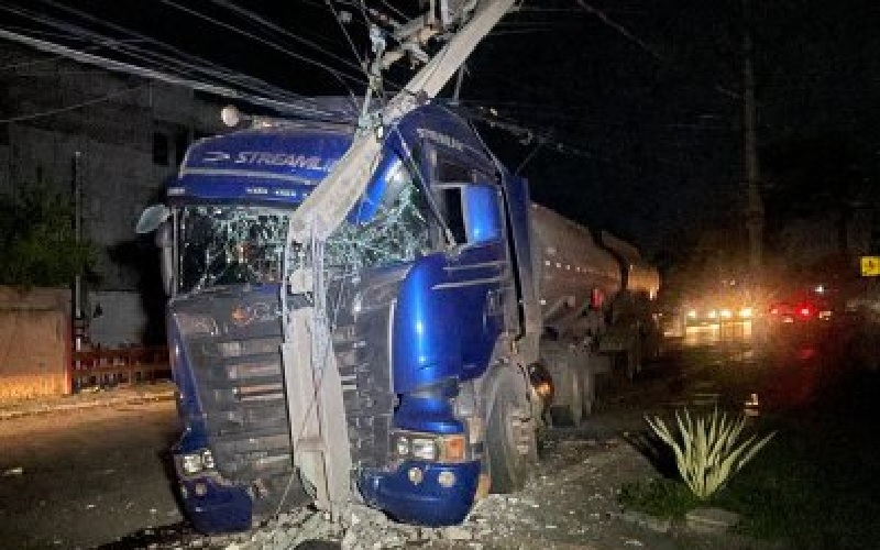 (Foto: Reprodução) – Uma carreta tanque acabou colidindo em um poste de energia em frente do condomínio Chapada dos Colibris, no bairro Jardim Imperial, em Cuiabá. O acidente ocorreu na noite desta quarta-feira (6).