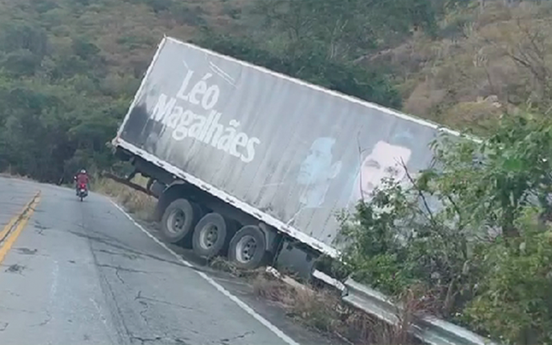 Uma carreta com equipamentos do cantor sertanejo Léo Magalhães ficou pendurada em uma ribanceira, na BR-148, entre as cidades de Livramento de Nossa Senhora e Rio de Contas, nesta terça-feira (25).