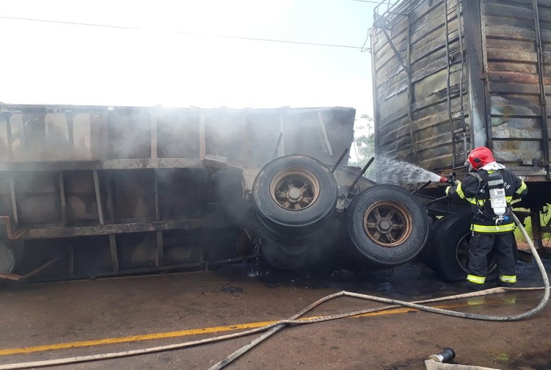 De acordo com testemunhas, as rodas do veículo teriam travado, aquecido e causado as chamas. O motorista, então, destravou a carroceria e soltou a carga que tombou na rodovia.