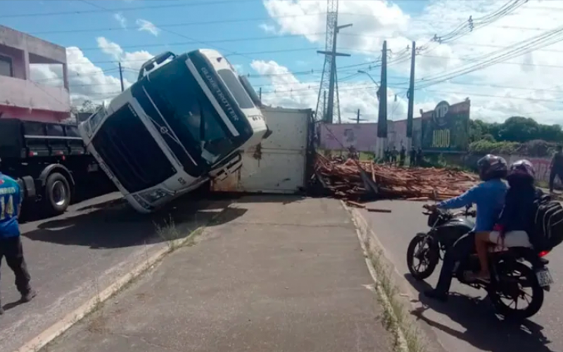 Segundo relatos preliminares, a carreta tombou enquanto o motorista tentava realizar uma manobra.