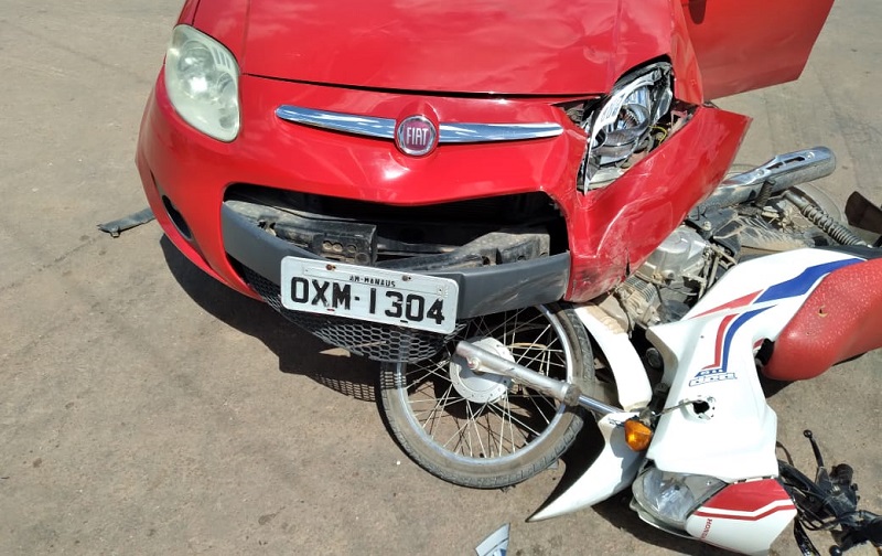 Um veículo Fiat Pálio vermelho, placa OXM 1304 Honda Civic preto colidiu contra uma motocicleta Honda Pop branca placa QVN 7J61, por volta das 14 horas desta terça-feira 28 de julho de 2021 , no cruzamento da Avenida Jamanxim com Rua Castro da Pátria centro de Novo Progresso.