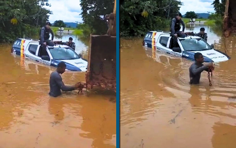 Um vídeo que circula nas redes sociais mostra o carro parado no meio da via embaixo da água e um policial em cima do veículo (assista acima). Um trator que passava pelo local foi acionado para retirar a viatura da área alagada. Em seguida, o carro foi rebocado até a base do 2º Pelotão com o apoio de moradores e de uma caminhonete.