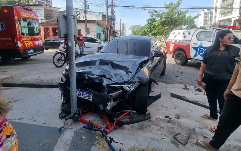 De acordo com a Superintendência Executiva de Mobilidade Urbana de Belém (Semob), uma condutora avançou o sinal vermelho no trecho e colidiu com o outro carro, considerado de luxo, atingindo o ciclista e o equipamento de trânsito.