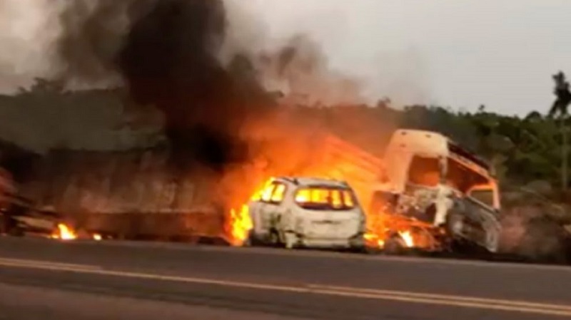 Carro e carreta pegam fogo entre os municípios de Nova Santa Helena e Terra Nova do Norte na BR-163 no MT