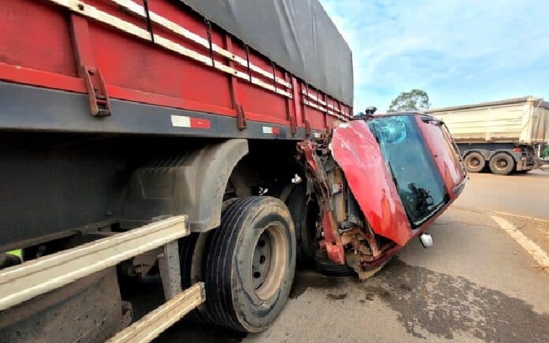 Carro é ‘prensado’ entre duas carretas na BR-163 em Sinop