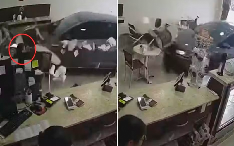 Carro invade doceria e criança escapa por um triz de atropelamento; VÍDEO