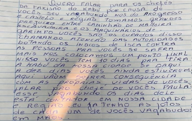 Carta anônima ameaça dirigentes da ONG Kabú em Novo Progresso