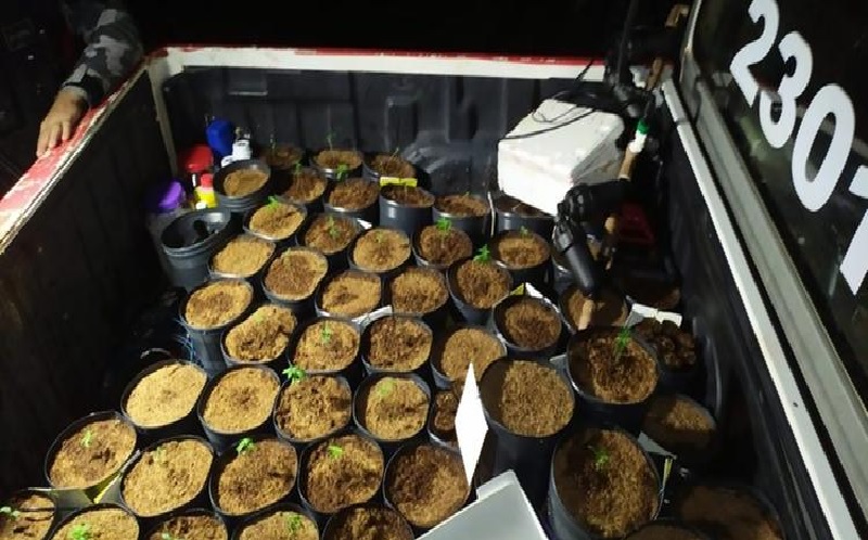 A PM apreendeu cerca de 60 mudas de maconha, além de produtos químicos e equipamentos utilizados para a conservação e controle de temperatura dos ilícitos. (Foto:Reprodução / Pebinha de Açúcar).
