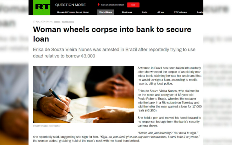 RT, da Rússia, repercute caso de mulher que levou morto a banco no Rio de Janeiro | Crédito: Reprodução/RT