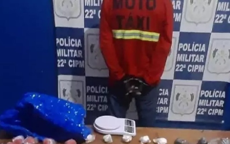 Os agentes da Polícia Militar foram informados de que um homem, vestido com uniforme de mototaxista, estaria fazendo a venda de entorpecentes em frente à casa onde mora, no bairro Cidade Nova. Com as informações, os policiais foram ao endereço para observar a movimentação. No local, a equipe identificou o suspeito e observou um intenso fluxo de pessoas realizando rápidas trocas. A situação, que costuma ser característica em pontos de tráfico de drogas, fez com que os agentes realizassem a abordagem.