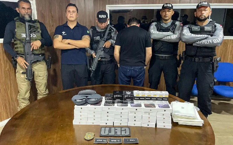 De acordo com a polícia, o flagrante ocorreu em abordagem de rotina à embarcação que trafegava pelo Rio Amazonas em frente ao município de Óbidos. No momento de inspecionar as bagagens, os agentes encontraram na mala de um passageiro 35 aparelhos celulares da marca iPhone 16 Pro Max; 06 unidades de medicamentos controlados; 03 loções hidratantes importados; 01 AirTag GPS e 01 fone de ouvido AirPods Max. Todos os produtos estavam sem nota fiscal.