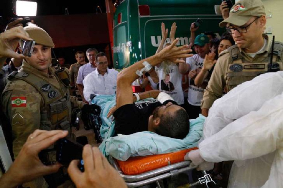 Alan Ruschel chega a hospital de Chapecó – Chapecó recebeu na noite desta terça-feira o retorno dos dois primeiros sobreviventes do desastre aéreo com a delegação da Chapecoense, na Colômbia. Por volta das 21h30, o lateral Alan Ruschel e o jornalista Rafael Henzel chegaram ao aeroporto do município catarinense a bordo do jato Legacy da Força Aérea Brasileira após mais de nove horas de deslocamento. Lágrimas dos parentes e a alegria da torcida pelas ruas da cidade traduziram o tom vitorioso da volta da dupla.