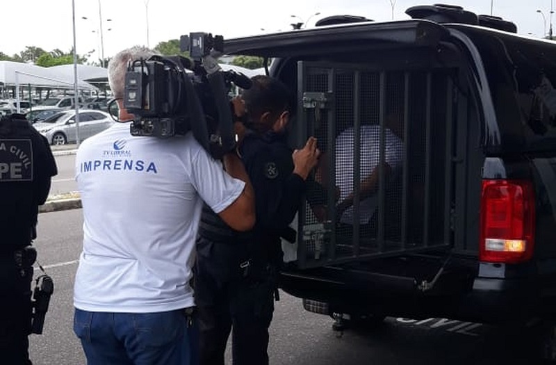 Marcelo Xará no aeroporto Internacional de Belém, no Pará, para ser transferido para o Rio de Janeiro nesta quarta-feira (21). — Foto: Denise Soares / TV Liberal