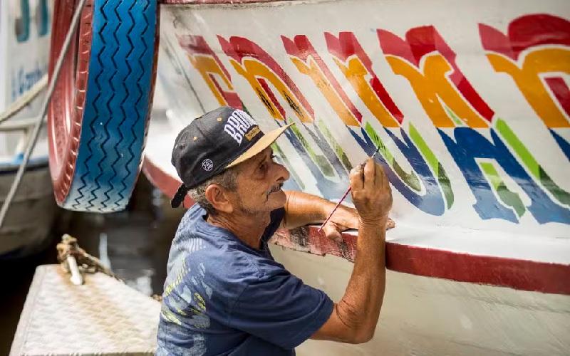 Na foto acima, Ramito Pintor, de Breves, no Marajó, abrindo letra na proa da embarcação — Foto: Nailana Thiely