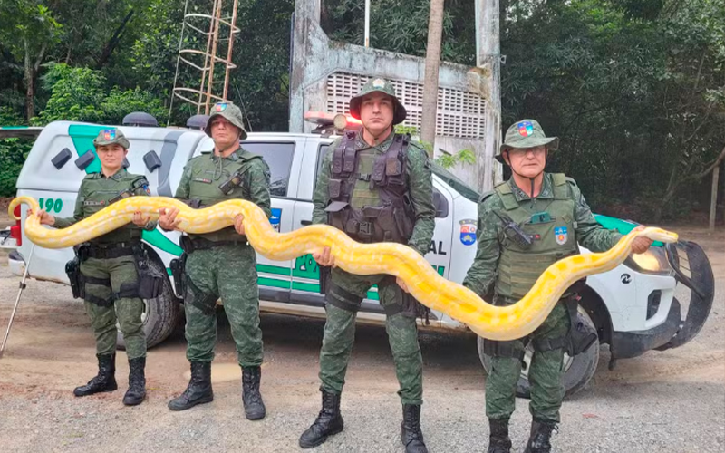 Segundo a polícia, cobra mede mais de 5 metros e é albina, condição que a torna ainda mais rara. Além dela, uma jiboia também foi resgatada na casa do escultor preso pelo assassinato de 4 jovens no Agreste de AL.