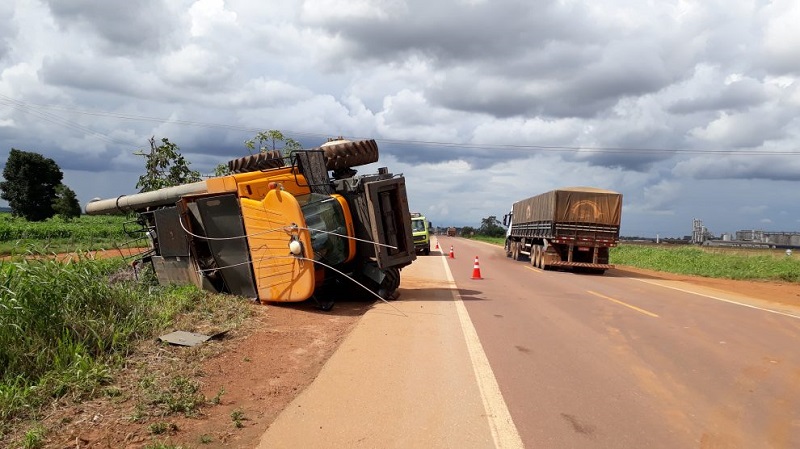 O acidente aconteceu, esta tarde, no quilômetro 816, da BR-163, próximo à usina que fabrica etanol de milho. Uma colheitadeira acabou se desprendendo de uma carreta, caiu na pista e ficou danificada.