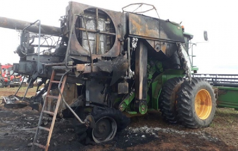 (foto: divulgação) – O acidente ocorreu, hoje, em uma fazenda localizada a cerca de 3 km da BR-364, próximo ao aeroporto Maestro Marinho Franco. De acordo com informações do Corpo de Bombeiros, quando a equipe chegou na propriedade o fogo já tinha atingido cerca de 50% da colheitadeira.