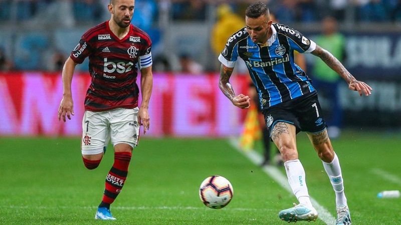 O jogo – O Flamengo não deixou o Grêmio esboçar qualquer pressão no início da partida e manteve a posse de bola. Com muitas trocas rápidas de passe, os rubro-negros quase abriram o placar aos oito minutos. Arrascaeta recebeu passe na área e chutou cruzado próximo ao gol. No minuto seguinte, Bruno Henrique arriscou de longe e assustou Paulo Victor.