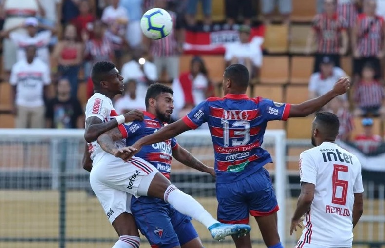 O São Paulo começou a partida a todo vapor. Com uma cara completamente nova sob o comando de Fernando Diniz, time marcou com intensidade e trocou muitos passes, se movimentando a todo momento, o que fez surgir diversas oportunidades de ataque para os donos da casa. Logo aos dois minutos, Hernanes recebeu com liberdade, se livrou da marcação, mas bateu fraco, facilitando o trabalho do goleiro Marcelo Boeck. Já aos 14, foi a vez de Arboleda cabecear sem muita força e ver o guarda-meta do Fortaleza fazer outra defesa.