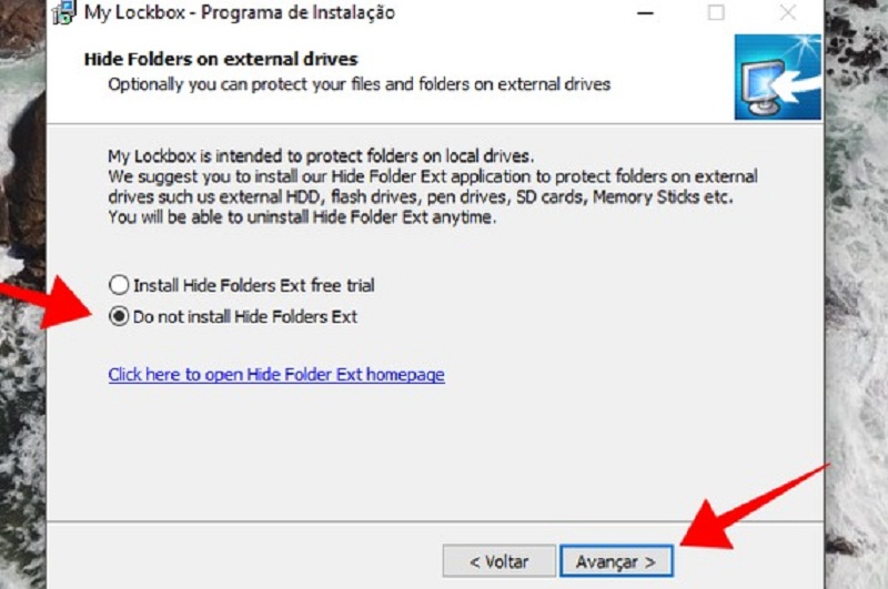 Passo 1. Baixe o programa gratuito My Lockbox no computador. Avance as telas do assistente para instalar. No final, certifique-se de marcar a opção “Do not install the Hide Folders Ext” antes de prosseguir.