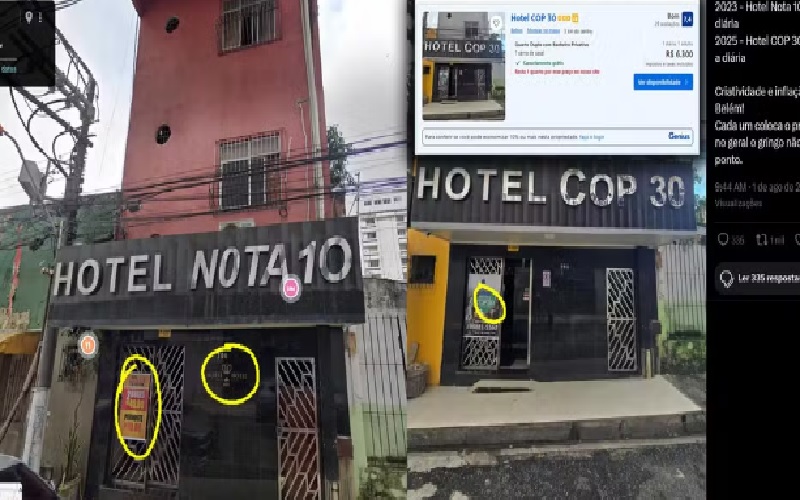 O Hotel Cop30 viralizou na semana passada com um post no X: a foto mostrava o “antes e depois” da fachada do estabelecimento e exibia um print de uma reserva na Booking, com o valor de R$ 6,3 mil. O g1 chegou fazer cotações de hospedagens por até R$ 7 mil no mesmo site.