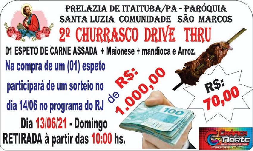 No dia 13 de junho acontecerá o “2º CHURRASCO DRIVE THRU” beneficente em prol do projeto de Construção da Igreja Católica da Comunidade São Marcos. O valor total arrecadado será destinado a compra de equipamentos.