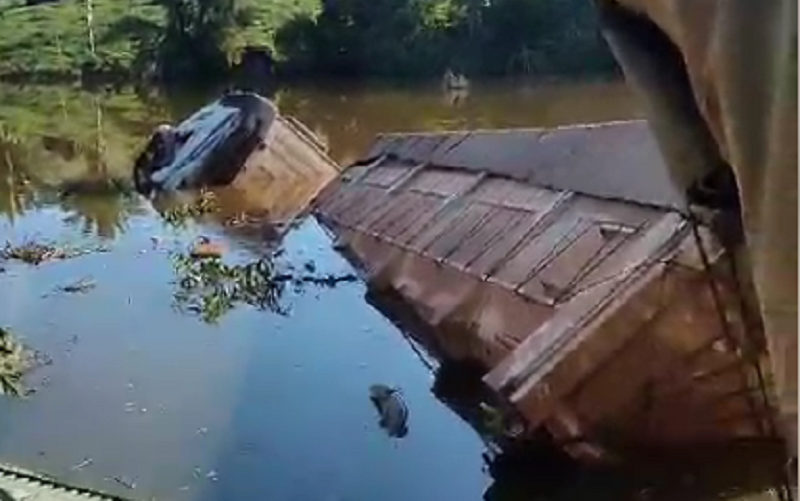 Apenas uma das carroceria foi parar com o caminhão dentro da Lagoa. (Foto: Reprodução Jornal Folha do Progresso)