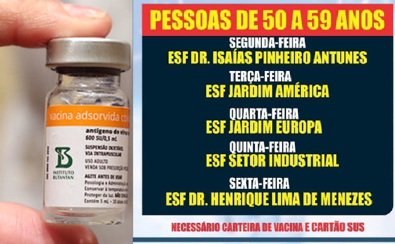 A vacinação para as pessoas de 50 a 59 anos, iniciou nesta segunda-feira (14) e estende até sexta (18), todas as pessoas com mais de 50 anos sem comorbidades da cidade de Novo Progresso podem procurar os postos para serem vacinadas contra a covid-19.