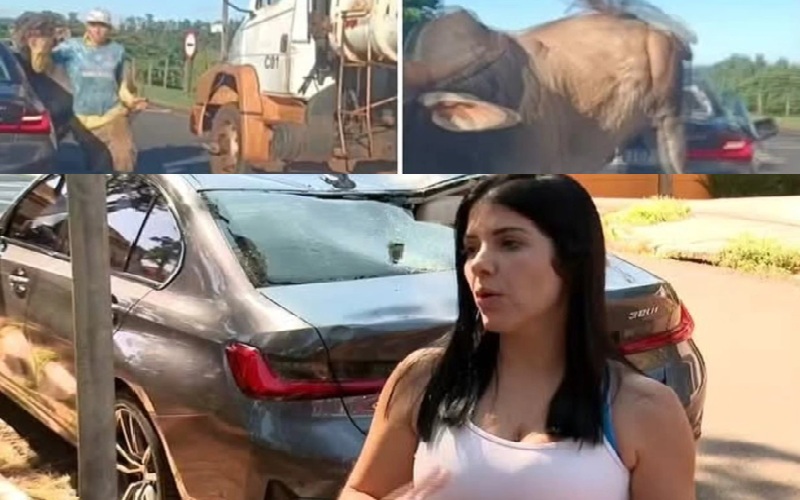 Além da BMW, o carro da assistente de eventos Paula Zeotti também foi atingido. Foi ela quem fez as imagens do ataque do touro.