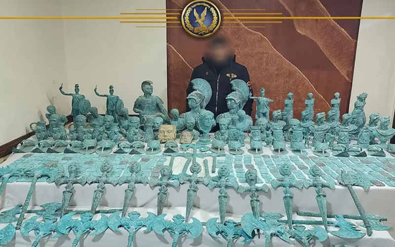 Cerca de 448 objetos foram recuperados, incluindo 305 moedas, 53 estátuas, 41 machados, 14 taças de bronze, 12 lanças e três cabeças de estátua. Os itens datam da Antiguidade grega e romana, abrangendo um período de aproximadamente 900 anos, de 500 a.C. a 400 d.C. O ministério divulgou fotografias dos artefatos apreendidos.