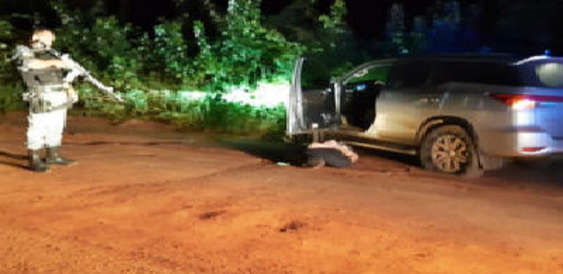 Diante da informação, policiais iniciaram buscas e um bloqueio foi feito na MT-343, entre Barra do Bugres e Cáceres. Os suspeitos tentara furar o bloqueio, momento em que os policiais atiraram contra os pneus da SW4.