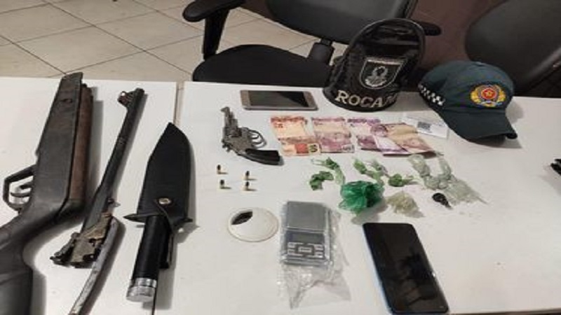 Diante das informações, a polícia foi até o local e constatou uma intensa movimentação em frente da residência supracitada. Inicialmente, Jeová Figueiredo Santos foi abordado e, com ele, os policiais encontraram e apreenderam 1 revólver calibre 22 com 4 (quatro) munições intactas, 1 (um) papelote de maconha pesando aproximadamente 18.1 gramas e 1 (uma) balança de precisão.