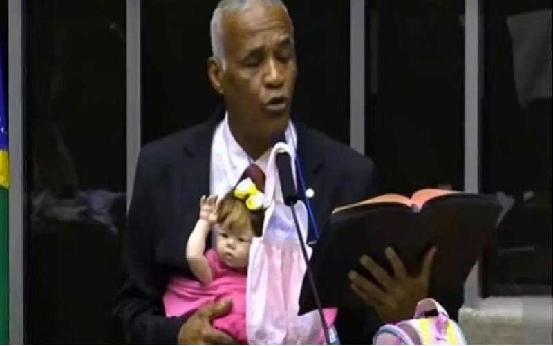 “Estou aqui com a minha neta, bebê ‘esborni’, sei lá como é o nome, para dizer ao Brasil que não é pecado”, afirmou, segurando o brinquedo no plenário.