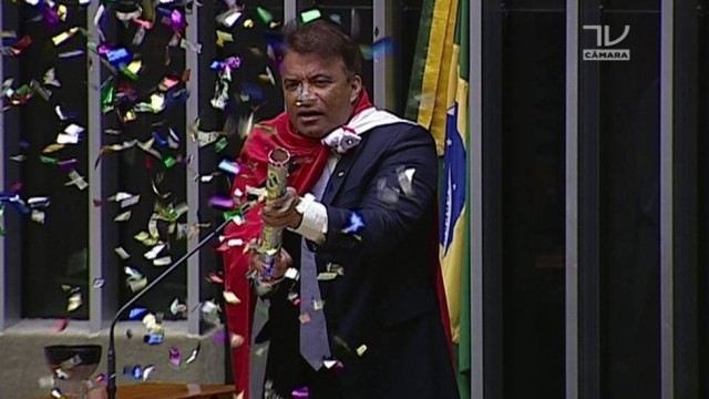 Foto: Reprodução-O atual cenário político brasileiro está longe de merecer um “parabéns”. Mas durante a maratona de votação do impeachment da presidente Dilma Rousseff na Câmara dos Deputados, um parlamentar decidiu levar um rojão de confetes e se tornou um verdadeiro hit nas redes sociais.