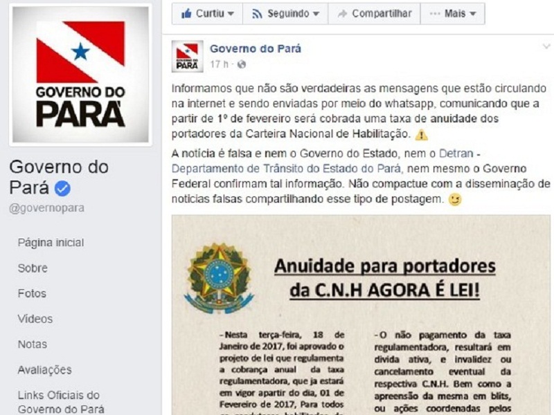 O Departamento de Trânsito do Pará (Detran-Pa) alertou nesta quinta-feira (19) para falsas informações compartilhadas em redes sociais a respeito de uma suposta cobrança de uma taxa anual para a manutenção da Carteira Nacional de Habilitação (CNH), que entraria em vigor a partir do dia 1º de fevereiro.